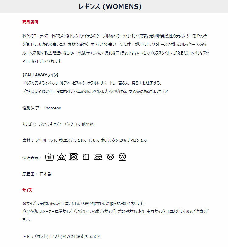 【30%OFF・SALE・セール】Callaway GOLF キャロウェイ ゴルフ 9286800 ケーブルニット レギンス (レディース) メーカー希望小売価格はメーカーカタログに基づいて掲載しています。 [あす楽]【あす楽_土曜営業】 商品価格:3,696円 レビュー件数:0件 レビュー平均:0(5点満点) 楽天で購入 トップページへ